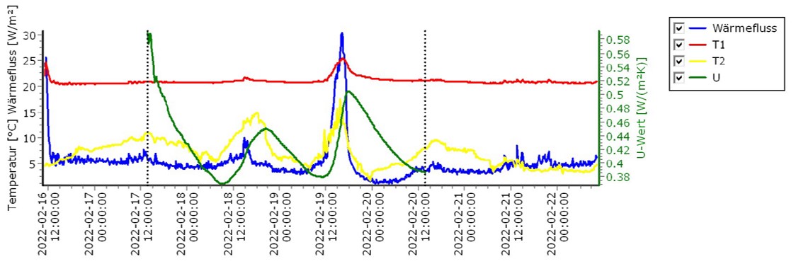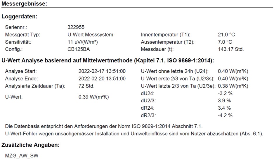 Unser Messverfahren verwendet einen Wärmestromsensor und zwei Temperatursensoren (siehe Video unten). Dieser Ansatz ist in ISO 9869, ASTM C1046 und ASTM C1155 genormt. Dies ist die einzige Methode, die zuverlässige quantitative In-site-Informationen über eine Gebäudehülle liefert.